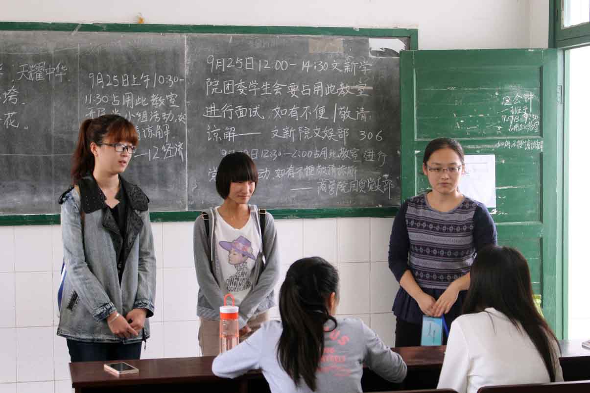 “天耀中华,天耀中华......”三教教室内传出嘹亮的歌声。在文娱部的小伙伴们有条不紊的组织下,百人大合唱正顺利进行。同时,新生也踊跃地参加这次活动。在教室里,同学们都认真聆听着文娱部部长们对歌曲的教习,并努力地学习着。他们自己默默地练习着,遇到问题也积极寻求文娱部小伙伴的帮助。随后,每位同学都或自信、或羞涩地秀出自己了的歌声,文娱部的学姐不时地点头、微笑,以示赞许。在文娱部小伙伴与同学们的默契配合下,选拔活动进行得十分顺利。经过两天的精心选拔,至25日傍晚时分,百人大合唱的暂定名单已出炉。