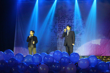 团委学生会部长们及主席团成员们献上极富创意的歌舞表演,更有新生班主任罗如春、朱军两位老师倾情献唱,赢得台下频频地欢呼与掌声,成为全场气氛最热烈的一段。最后,绿帽社