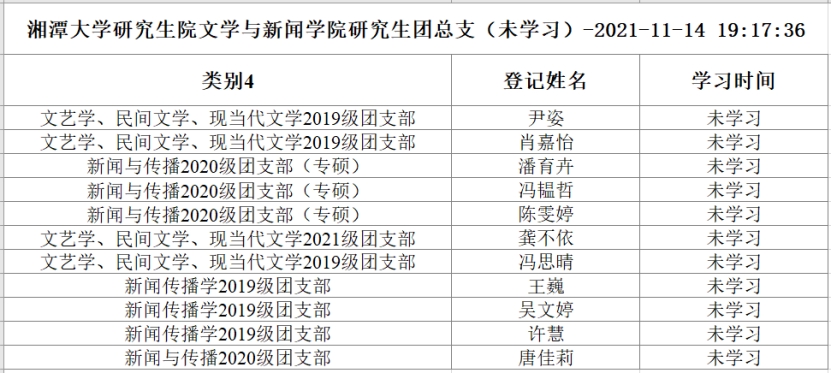 青年大学习第十二季第7期学习已截止,截止时间为11月14日晚七点。现将未学习名单公布如下。请各团支部书记今后务必认真督促团支部成员,落实每周青年大学习的完成。