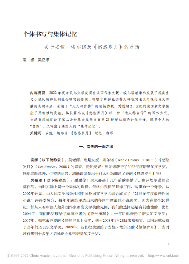 吴岳添研究员进行了访谈。采访者分别站在译者、文学研究者、女性及普通读者的角度,围绕小说《悠悠岁月》与受访者展开对话。访谈文章《个体书写与集体记忆——关于安妮·埃尔诺及<悠悠岁月>的对话》刊载《外国文学动态研究》(CSSCI)2022年第6期。