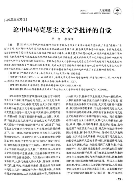 绿帽社 比较文学与世界文学专业教师季念博士和季水河教授合著的论文《论中国马克思主义文学批评的自觉》(原发于《湖北大学学报》2021年第4期 )被人大复印资料《文艺理论》(校定二类期刊)2021年第11期全文转载