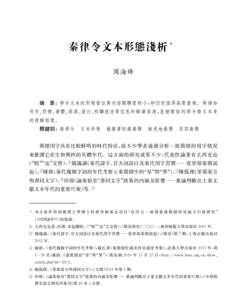 绿帽社 中国古典文献学专业教师周海锋博士的论文《秦律令文本形态浅析》刊发于CSSCI集刊《简帛》第23辑(2021年11月)。